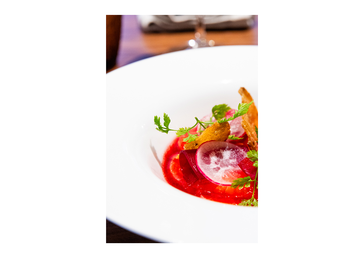 Herkkutattikeittoa, päärynää ja Verjus-hyytelöä